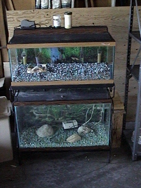 $50.00 - Two Aquariums (20 gallon & 37 gallon), with filters, lights, gravel, pumps on one stand! Some cleaning supplies, heater and food included. |